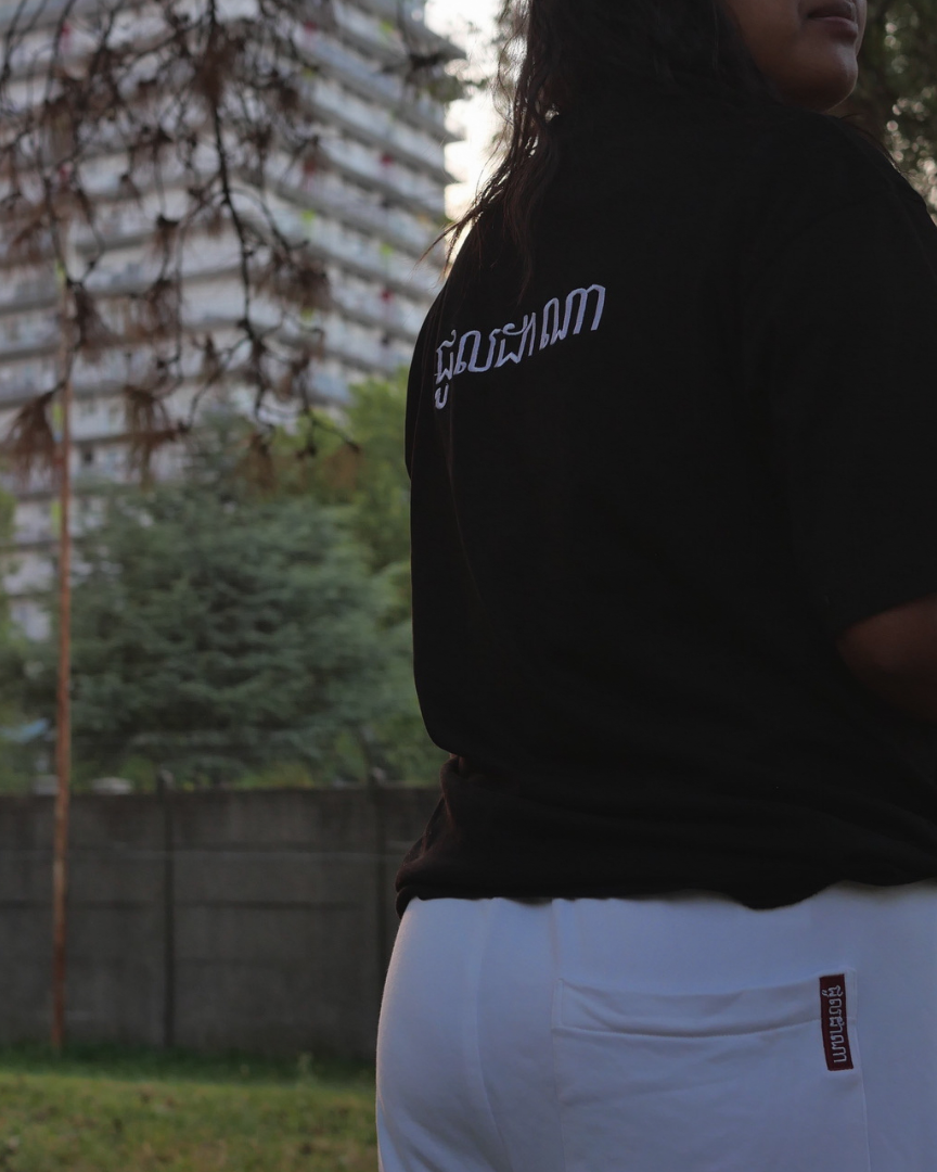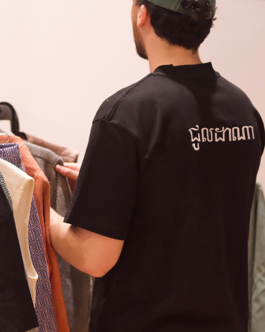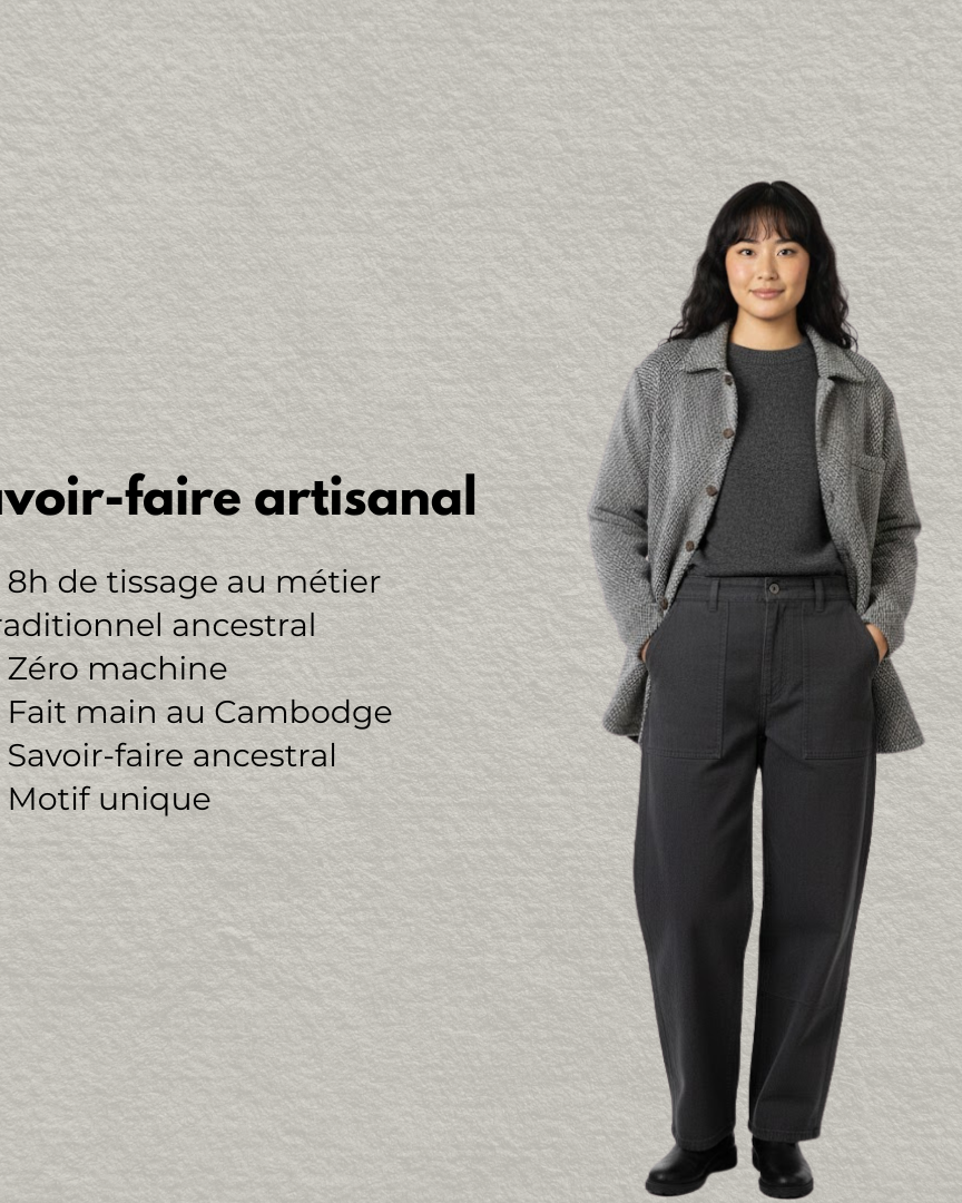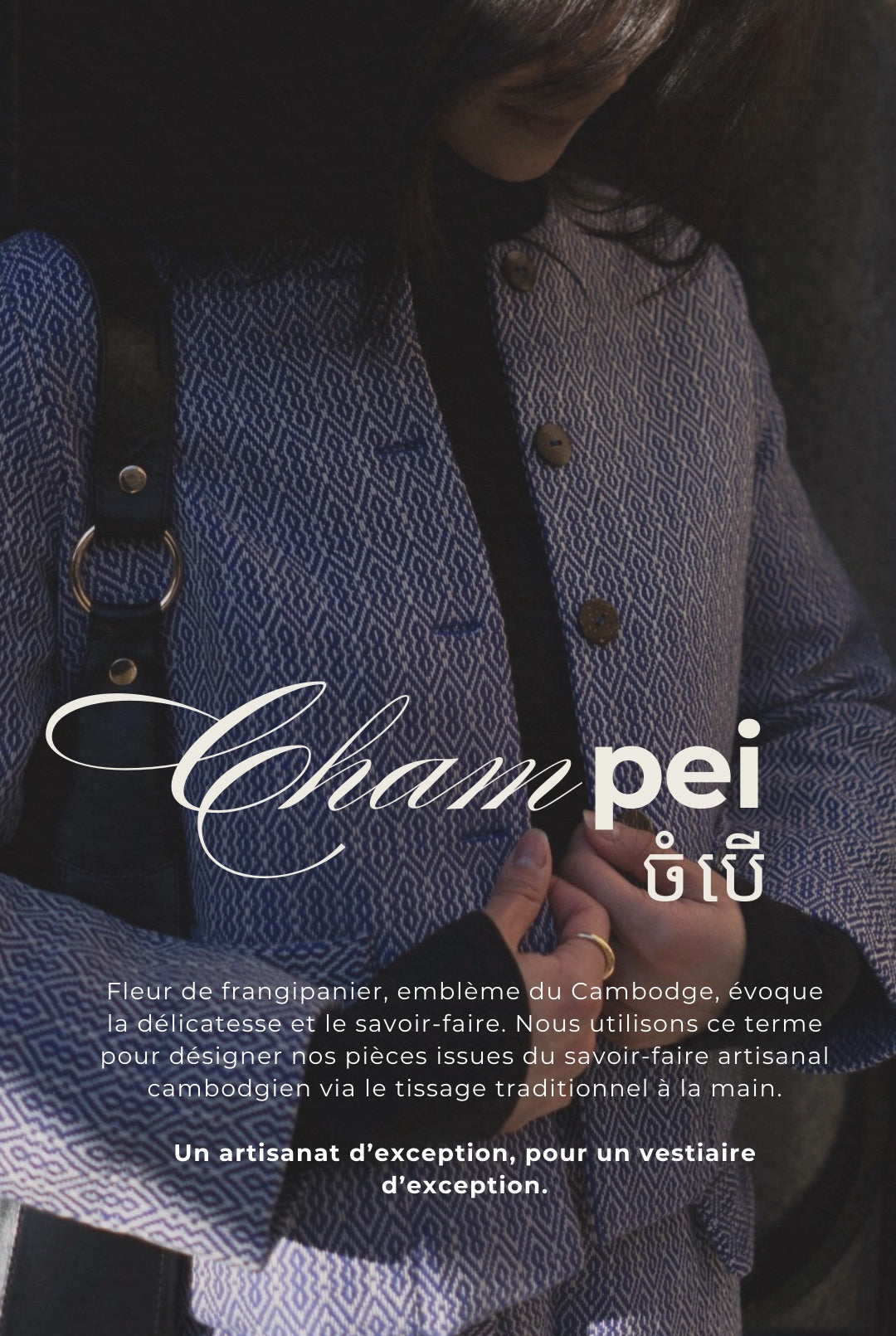 Une mode durable, qui respecte l’humain et l’environnement, basée sur de la revalorisation des tissus dormants de l’industrie textile locale et une mise en lumière des savoir-faire traditionnels cambodgien dans l’art du tissage à la main.