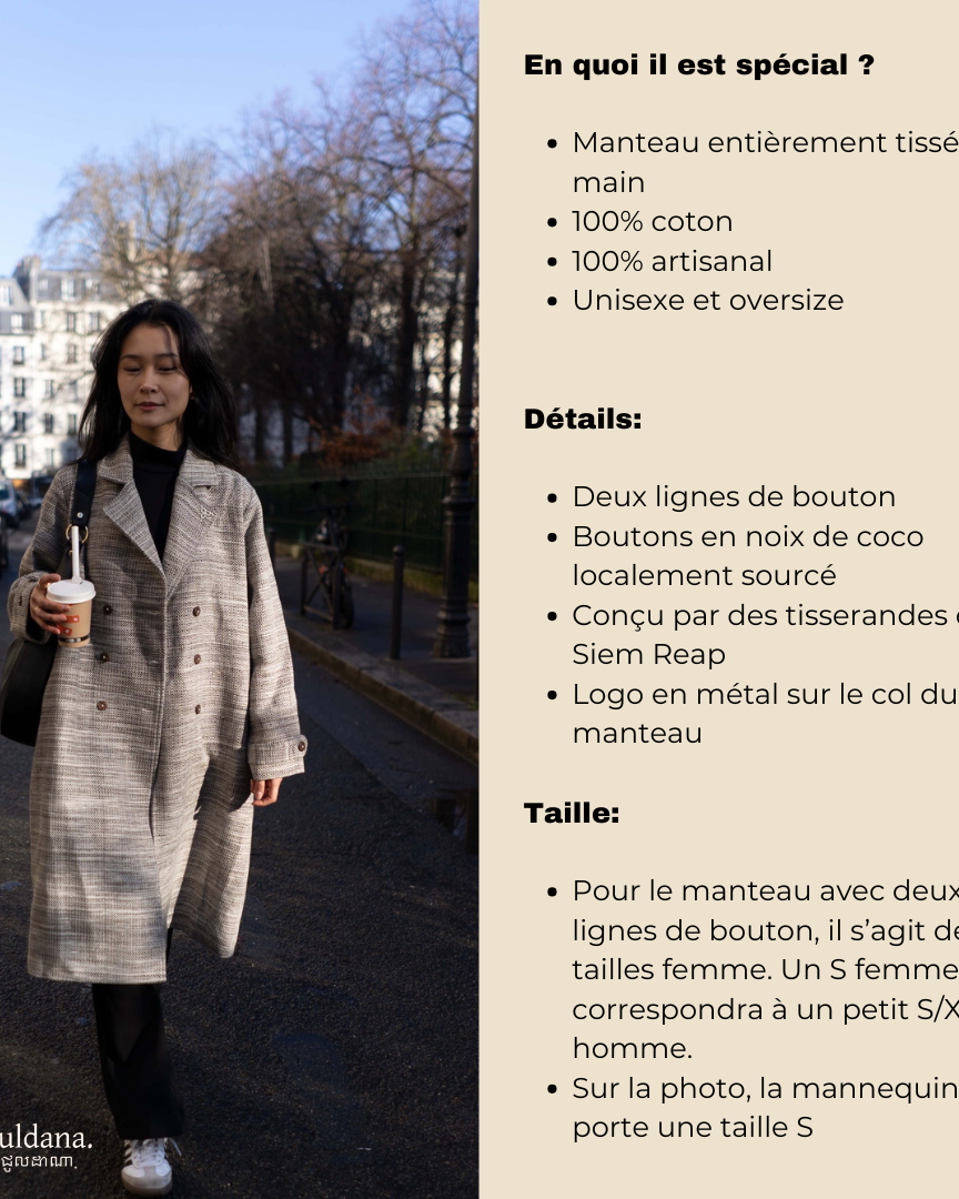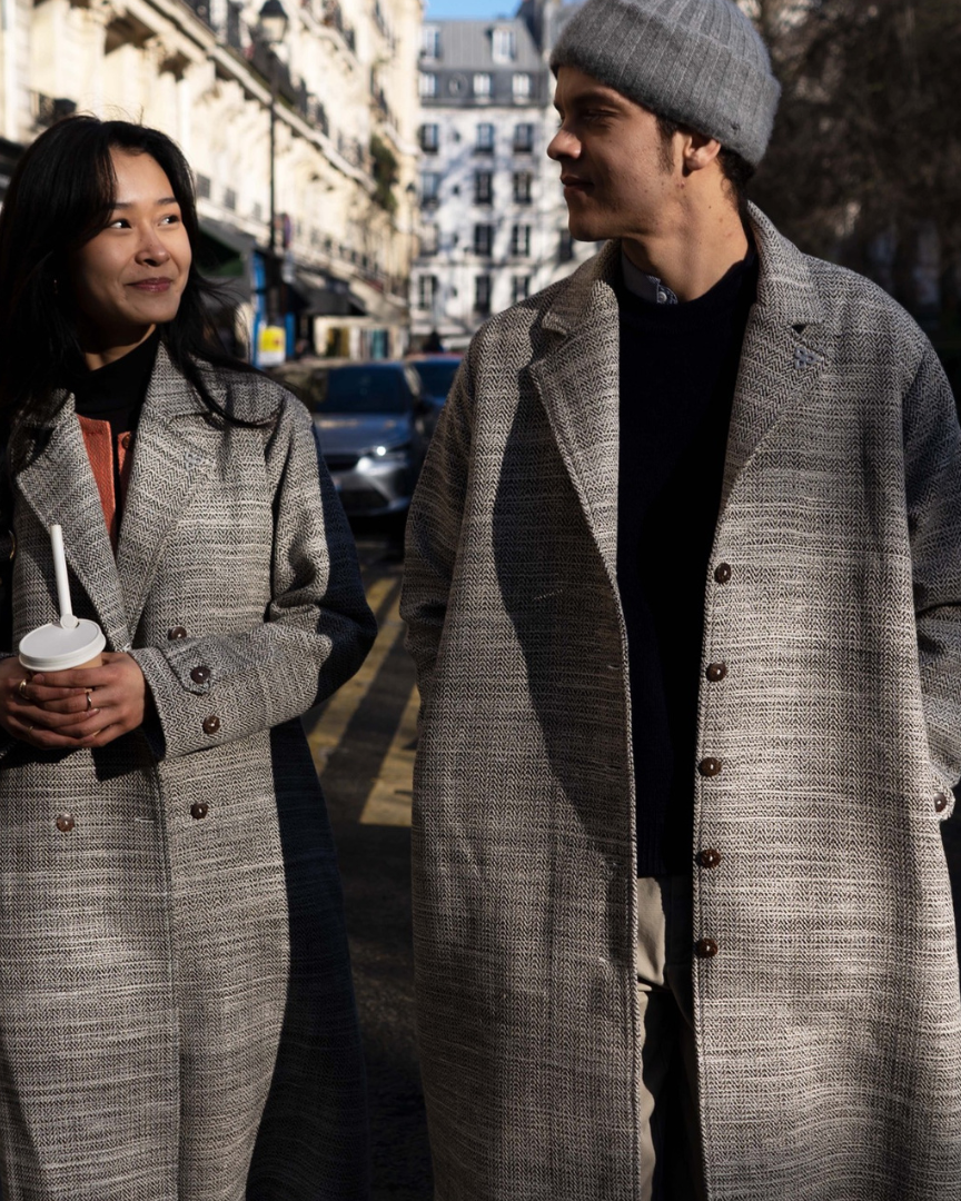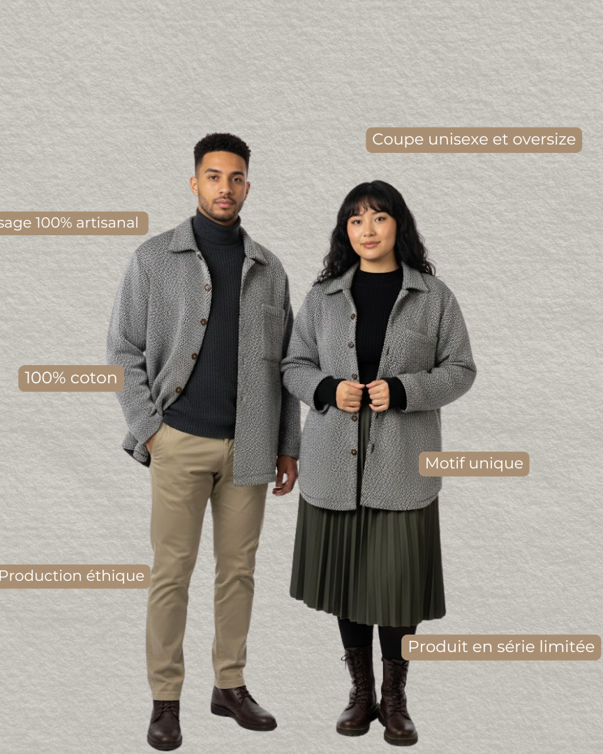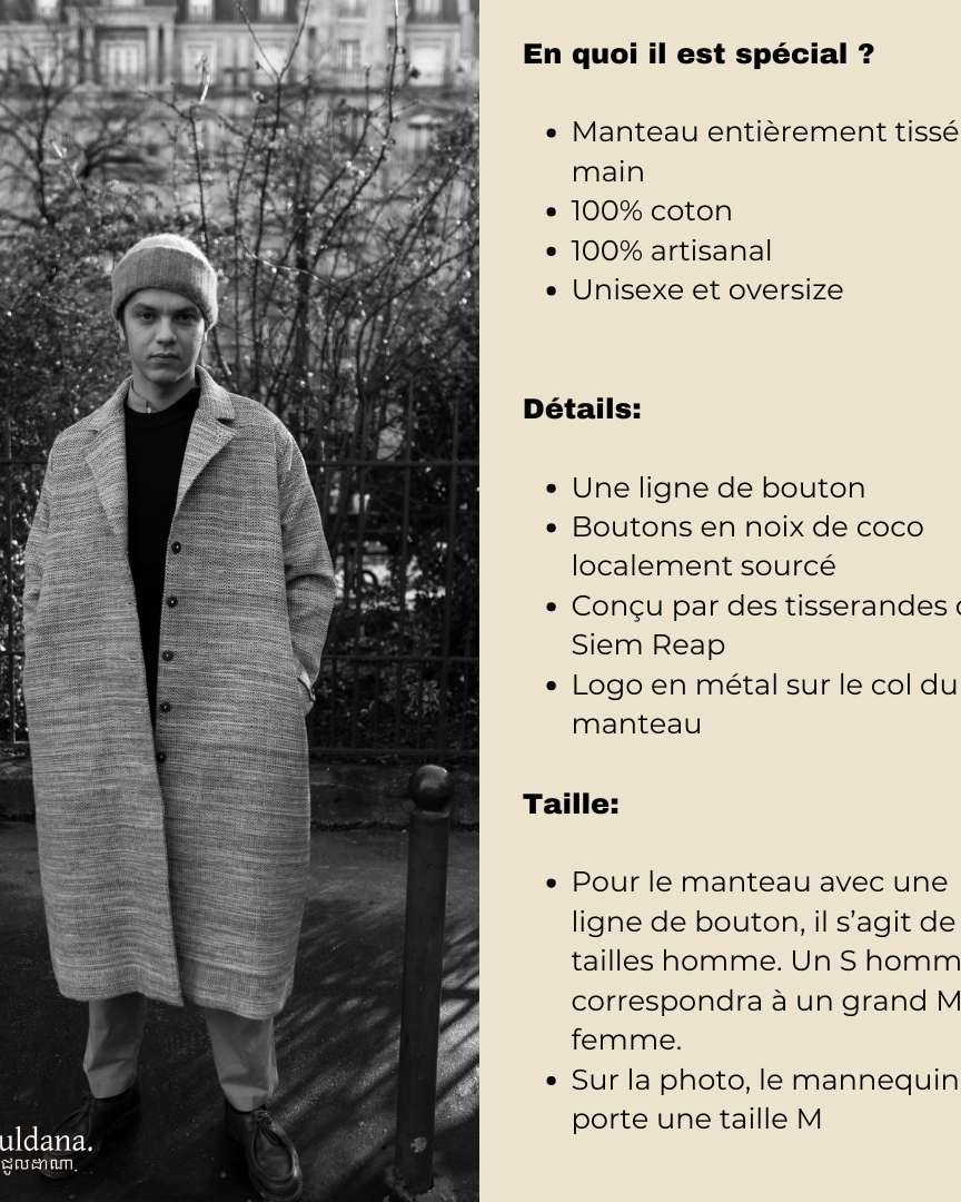 Découvrir la collectionCe manteau au mélange de couleur gris, noir, blanc est une pièce unique et artisanale. Sa coupe oversize, entièrement tissé à la main en 100% coton en fait une pièce intemporelle de sa garde-robe, pour homme et femme.
