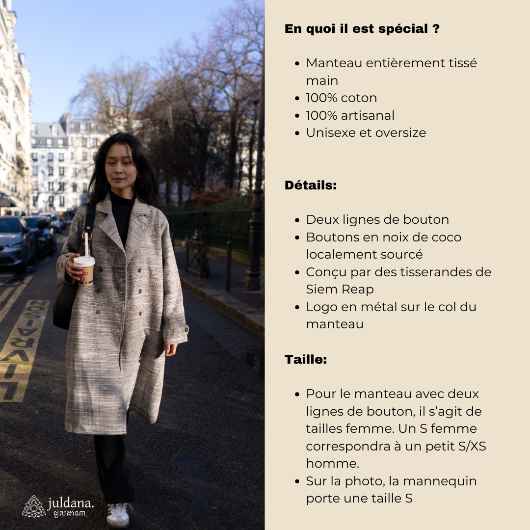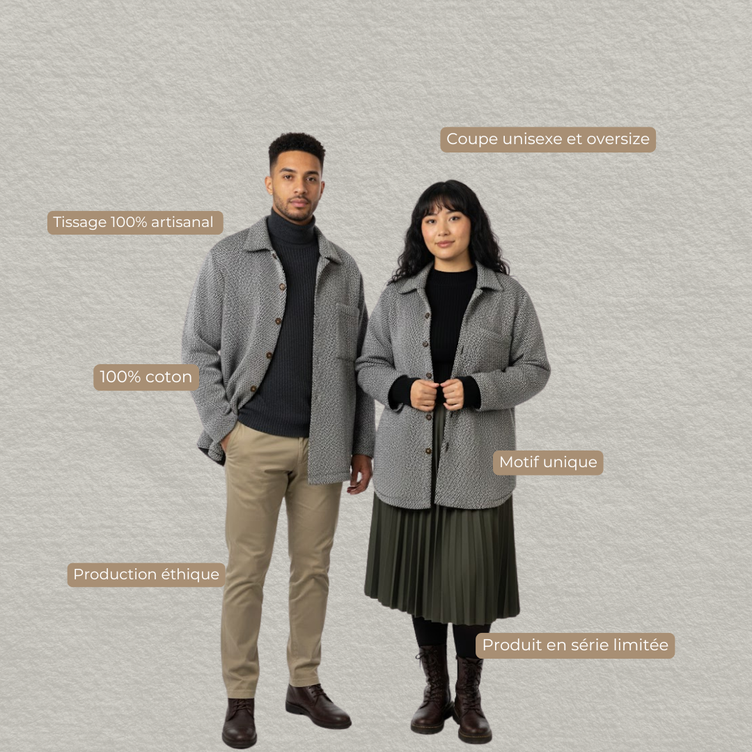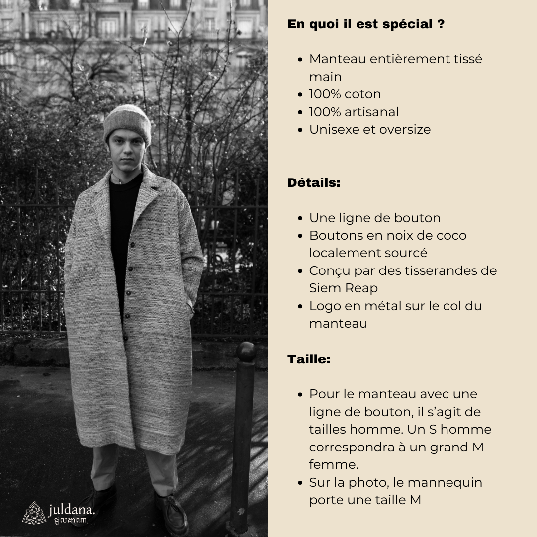 Découvrir la collectionCe manteau au mélange de couleur gris, noir, blanc est une pièce unique et artisanale. Sa coupe oversize, entièrement tissé à la main en 100% coton en fait une pièce intemporelle de sa garde-robe, pour homme et femme.