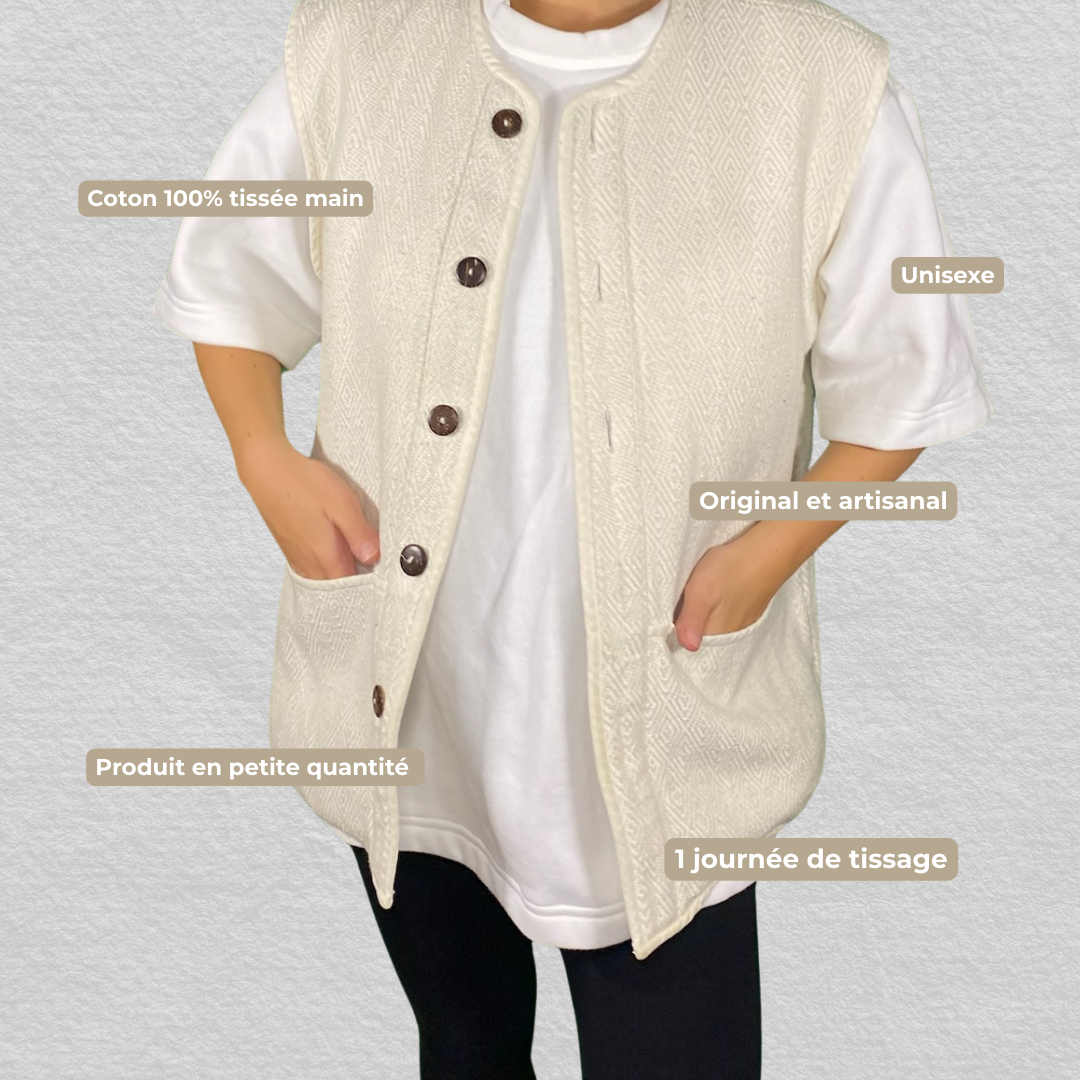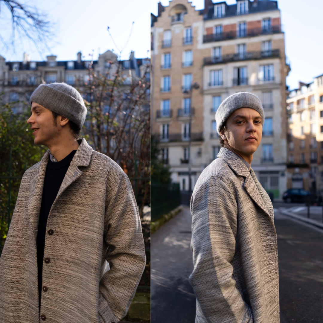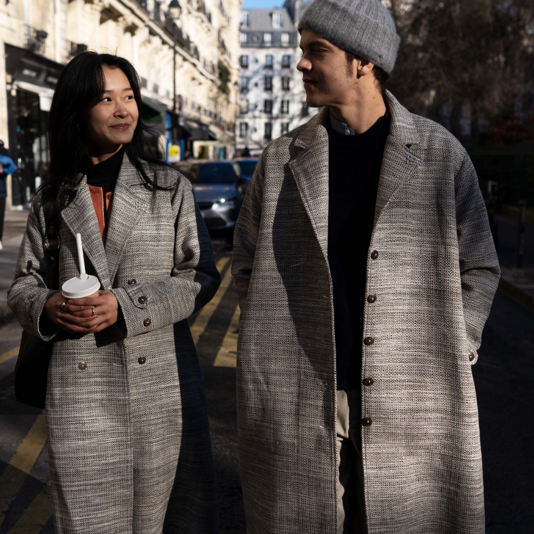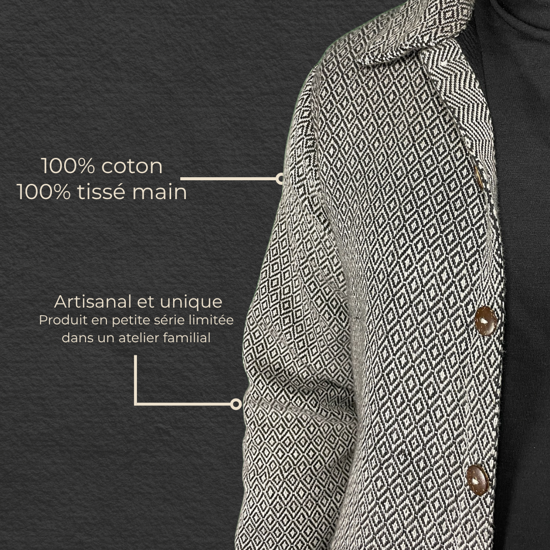 Découvrir la collectionCe manteau au mélange de couleur gris, noir, blanc est une pièce unique et artisanale. Sa coupe oversize, entièrement tissé à la main en 100% coton en fait une pièce intemporelle de sa garde-robe, pour homme et femme.