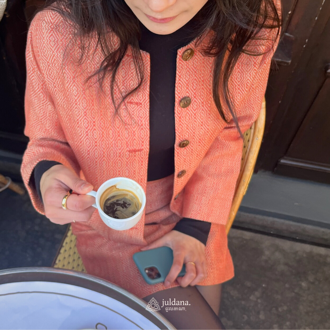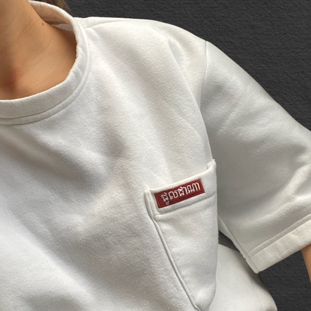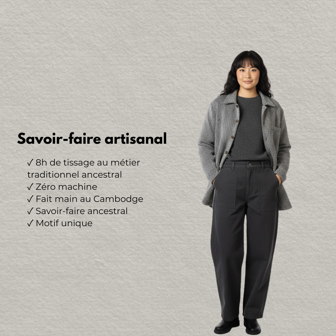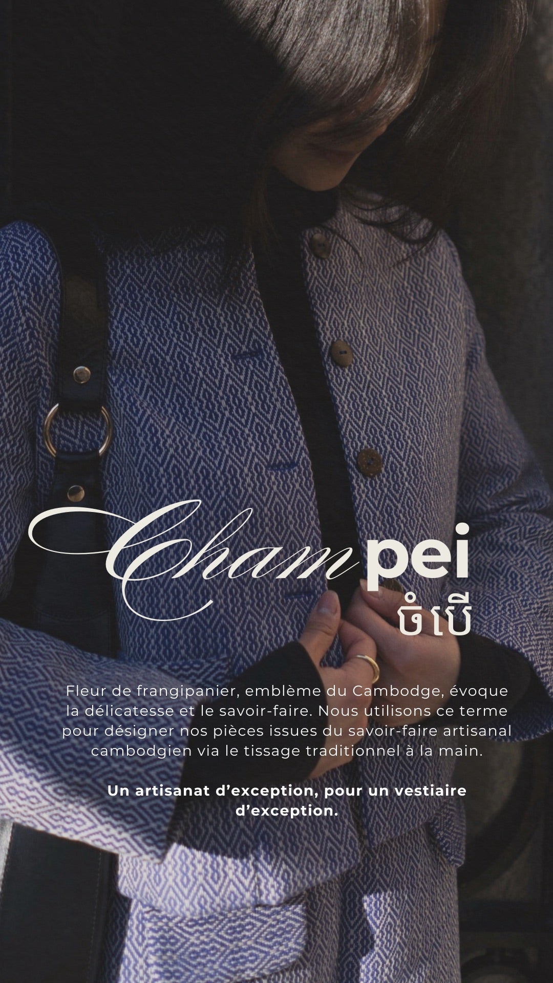 Une mode durable, qui respecte l’humain et l’environnement, basée sur de la revalorisation des tissus dormants de l’industrie textile locale et une mise en lumière des savoir-faire traditionnels cambodgien dans l’art du tissage à la main.