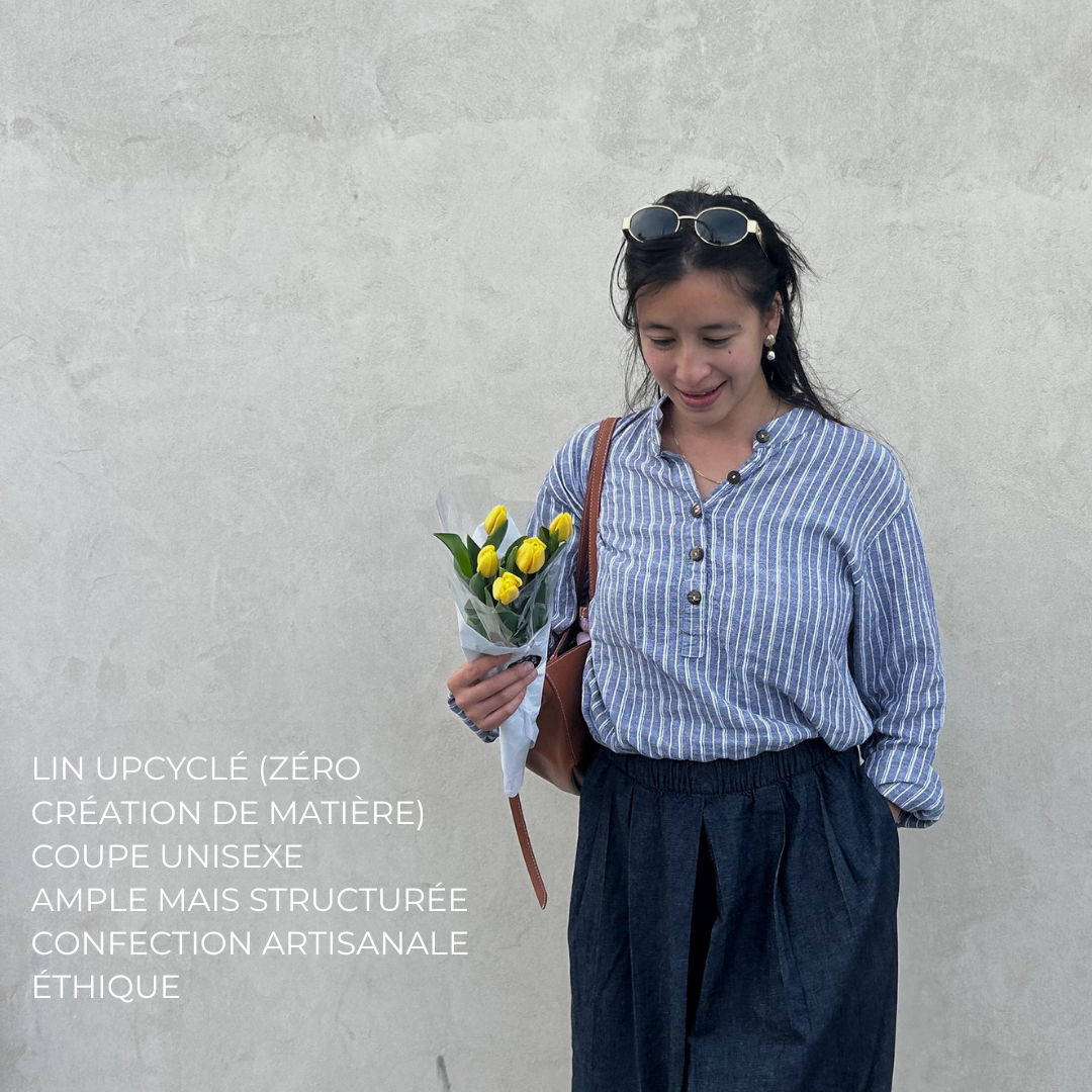 Le retour à la lumière. Des pièces uniques, simples et minimalistes, en lin upcyclé, en coton upcyclé ou entièrement issues de savoir-faire artisanal.